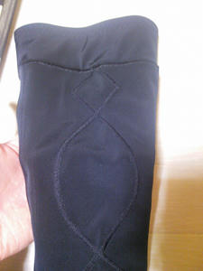 ひざに装着してみると、けっこう上まで、太ももの中間あたりまできます。
